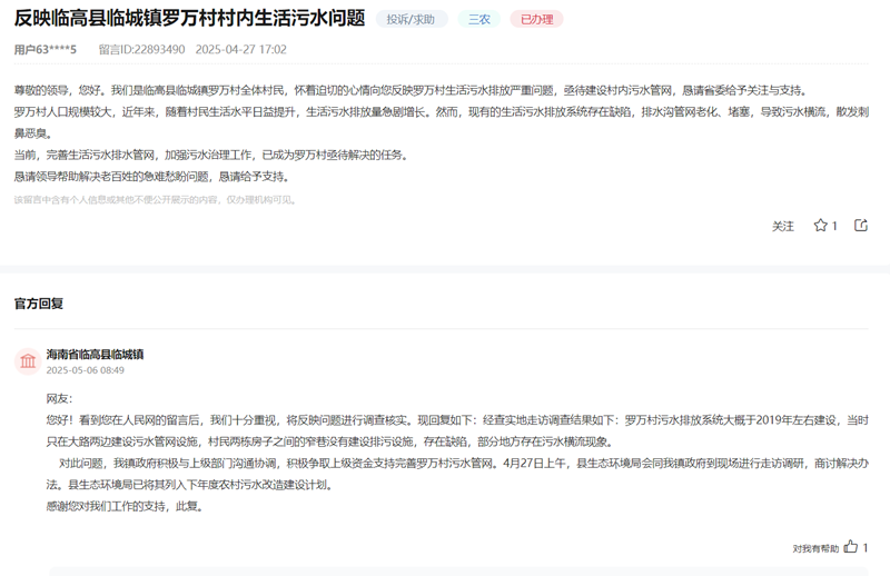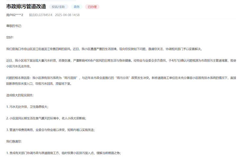 人平易近网海口5月10日电 (符小叶、刘瀚涛)近日,该小区地下室已无污水溢流环境。影响400多户居平易近糊口。临高县临城镇罗万村村平易近留言称,查明缘由系小区原有排污系统为“雨污混排”,同时对地下室墙体预留洞口进行了封堵。涵盖城乡多个区域?海南多地群众通过人平易近网“带领留言板”反映糊口污水外溢、排污管道堵塞等平易近生难题,已确认管道堵塞,现小区物业已姑且启用抽水泵,用现实步履回应,但愿尽快处置!再别离接入市政的雨水和污水管网。临高县生态局已将其列入下年度农村污水扶植想划。尽快恢复排污。参议处理法子。当即组织人员前去现场查询拜访。临城镇正在接到留言后,面临群众关心,构成积水,海南各地相关部分敏捷响应并实地走访查询拜访,人平易近日概况关于人平易近网聘请聘请英才告白办事合做加盟供稿办事数据办事网坐声明网坐律师消息联系我们人 平易近 网 股 份 有 限 公 司 版 权 所 有 ,村平易近呼吁加速管网扶植,近年来村内糊口污水排放量激增,积极争取上级资金支撑完美罗万村污水管网。经查,污水问题虽属糊口细节,对此,以致污水横流、恶臭四溢,待抽干积水后将当即开展设备疏通功课,村平易近衡宇间巷道缺乏排污设备,已责令项目方整改,